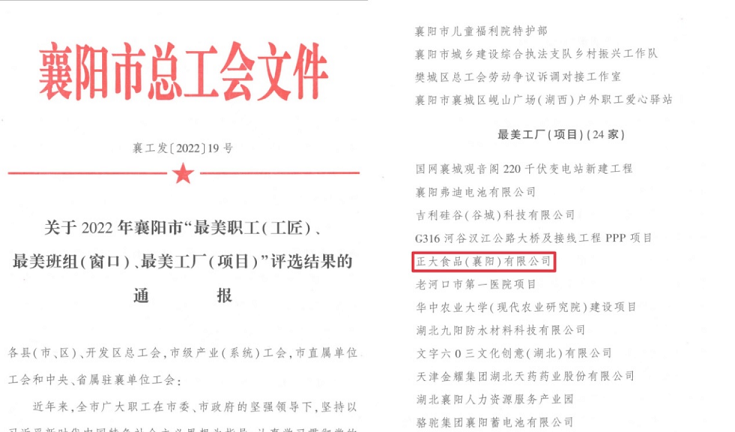 為廣泛開展美好環境與幸福生活共同締造活動,評選為襄陽市經濟社會高質量發展做出積極貢獻的單位和群體及個人,襄陽市總工會開展了尋找襄陽市“最美職工(工匠)、最美工廠(項目)、最美班組(窗口)”的活動。歷時2個月的多輪評定,襄陽市總工會決定授予正大食品(襄陽)有限公司——襄陽市“最美工廠(項目)”獎項。
